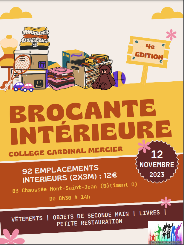 L’Association des Parents du Collège Cardinal Mercier est très heureuse de vous convier à la quatrième édition de sa grande brocante intérieure !